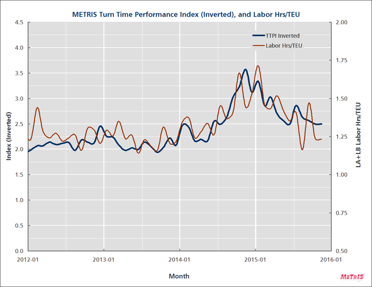 The TTPI expresses performance rather than delay: i.e. a high score is good. But in the case of raw turn time and labor hours, it's low numbers that indicate good productivity. So in Figure 3, we invert the TTPI to be directionally consistent with the labor metric. And we superimpose labor hours per TEU. Voila! They're practically twins. It's interesting that the blue curve is sourced from GPS instruments and analysis; the brown curve from two independent sources: labor and container statistics. And there's only a rudimentary attempt to match the scales on the axes. This is an unexpected, spectacular correspondence.